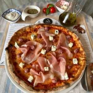 (Aluat, sos roșii, mozzarella, prosciutto cotto, ciuperci, busuioc, 500-550g)