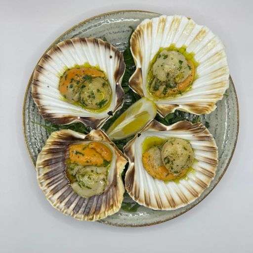 (San Jaque / capesante (4 buc), vin alb, sare, piper, suc de lămâie, pătrunjel, 120g)