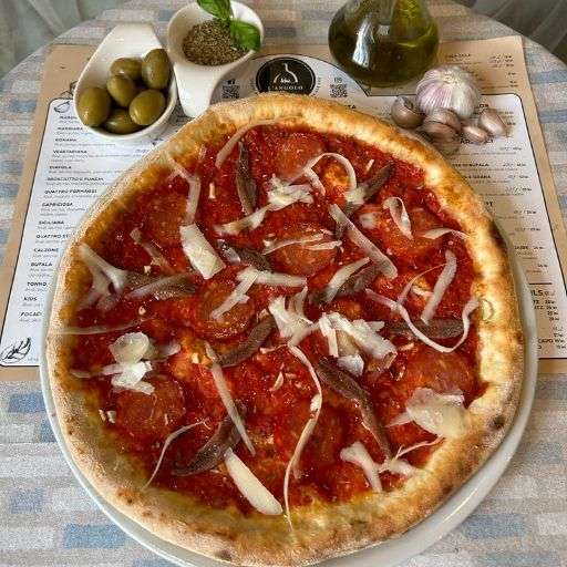(Aluat, sos roșii, anșoa, usturoi, salam picant, grana padano, 450-500g)
