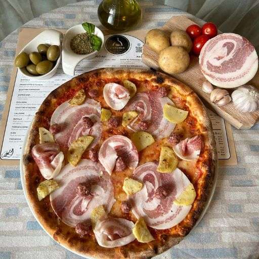 (Aluat, sos roșii, mozzarella, salsiccia, cartof copt, pancetta, 600-650g)